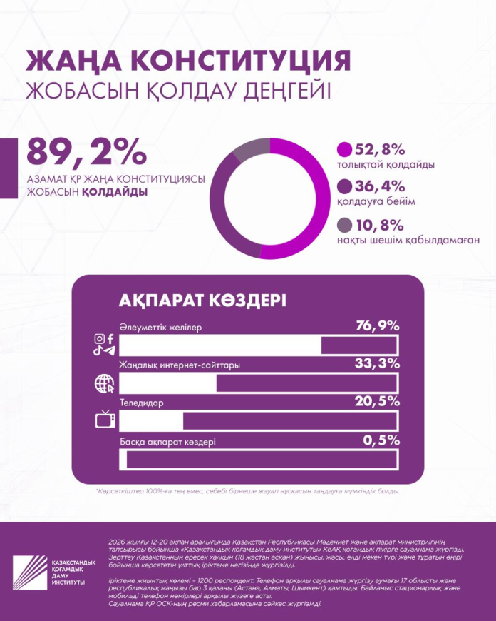 Алынған деректерге сәйкес, қазақстандықтардың көпшілігі – 89,2%-ы – Жаңа Конституция жобасын қолдайды. Олардың ішінде, сауалнама қатысушыларының 52,8%-ы жобаны толықтай қолдайтынын, ал 36,4%-ы жобаны қолдауға бейім екенін айтты. Ал әртүрлі себептермен Жаңа Конституция жобасын қолдамайтын немесе әлі таңдауын жасамағандар үлесі бар-жоғы – 10,8%.